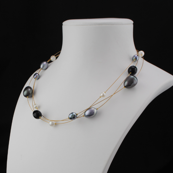 Un collier avec perles noires fantaisie monté sur un câble solide en acier gainé. Le fermoir est en argent. Nous proposons une finition plaqué argent rhodié ou plaqué or. Cette finition garde tout son éclat dans le temps.